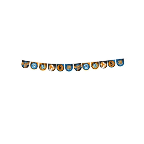 Diese Nerf-Girlande ist offiziell von Hasbro lizenziert. Die Girlande misst ca. 400cm Länge und ist mit den Punkten gestaltet, die man mit den Nerf-Spielzeugen erzielen kann. Gestaltet in Orange, Blau und Schwarz ist diese Girlande die perfekte Partydeko für einen Nerf-Kindergeburtstag!