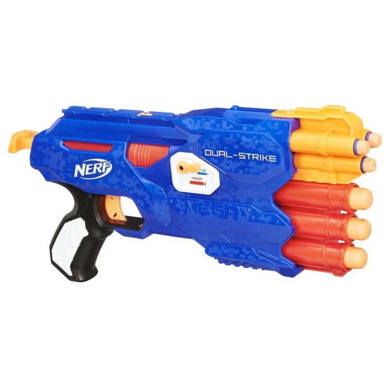 Die Nerf N-Strike Elite Dual Strike sieht nicht nur stylisch aus, sondern verschießt sogar gleich zwei verschiedene Darts. So kann der Kippschalter je nach Mission verändert werden um zwischen den Dartgrößen zu wechseln. Im Set enthalten sind drei Elite und drei Mega Darts. Geeignet ab acht Jahren.