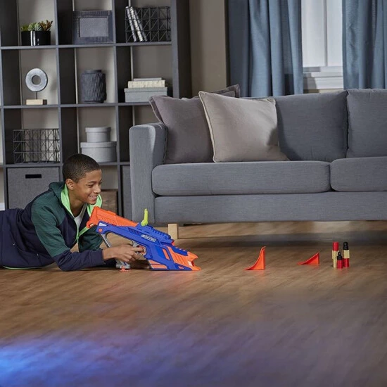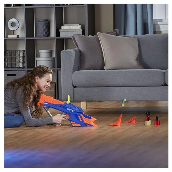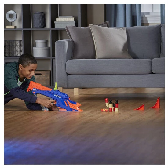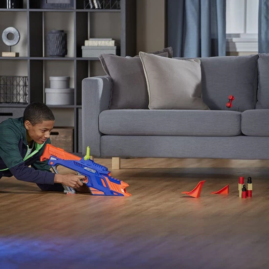 Schneller Speed, sensationelle Sprünge und spektakuläre Stunts – NERF Nitro bedeutet rasante Action, individuell aufbaubare Rennstrecken und turbomäßig viel Spaß. Das MotoFury Rapid Rally Set aus dieser abgefahrenen Produktserie von NERF wartet mit einem motorisierten Turbo-Blaster und jeder Menge Zubehör auf. Mit 9 Soft Racern, die in das Magazin des batteriebetriebenen Blasters eingesetzt und nacheinander abgefeuert werden, ist extrem schneller Renn- und Stuntspaß angesagt. Dieses Set enthält 1 Blaster, 1 Hochsprung-Rampe, 1 Weitsprung-Rampe, 9 Soft Racer und 12 Hindernisse. 4 x 1,5V AA (LR6) Batterien nicht enthalten.