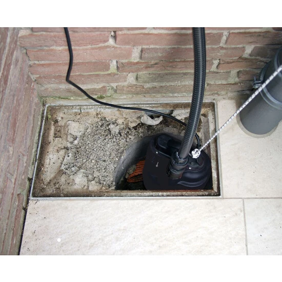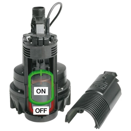 Speziell konstruierte Drainage-Tauchpumpe mit vertikalem Pumpenausgang und integriertem Schwimmerschalter.