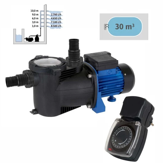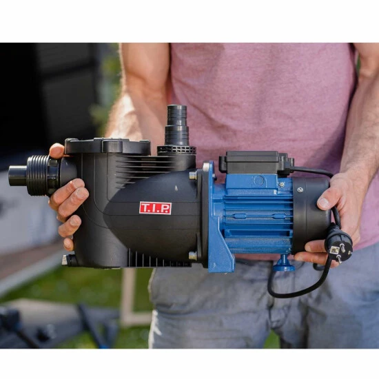 TIP SPP – Pool Serie- Zum Betreiben eines Poolfiltersystems- Selbstansaugende Poolpumpen ideal zur Installation in den Filterkreislauf- Integrierter Vorfilter zum Entfernen des Grobschmutzes- Inklusive Schlauchanschlüsse für gängige Schwimmbadschläuche (Ø 32/38 mm)- Ausgestattet mit wassergeschütztem Timer und OutdoorsteckdoseLeistungsstarke selbstansaugende Schwimmbad-und Poolpumpe aus hochwertigem Kunststoff. Die Pumpe ist mit einem Vorfilter zum Schutz vor Beschädigungen vor Grobschmutz ausgestattet. Im Lieferumfang befinden sich zwei Anschlussstücke und eine Zeitschaltuhr mit der die Programmierung von täglichen Reinigungsintervallen möglich ist. Die Pumpenkapazität ist für ein Beckenvolumen bis 30.000 Liter ausreichend.Die Schwimmbad- und Poolpumpe hat viele Funktionen. Die wichtigste Aufgabe ist das Umwälzen: Die Pumpe saugt das Wasser aus dem Pool in die Filteranlage, dort wird es gesäubert und zurück in das Becken gespült. Je nach Nutzungs- und Verschmutzungsgrad sollte der Beckeninhalt täglich zwei Mal umgewälzt werden. Die empfohlene Betriebsdauer ist 8 bis 9 Stunden pro Tag.– Zum Betreiben eines Poolfiltersystems– Selbstansaugende Poolpumpe ideal zur Installation in den Filterkreislauf– Integrierter Vorfilter zum Entfernen des Grobschmutzes– Inklusive Schlauchanschlüsse für gängige Schwimmbadschläuche (Ø 32/38 mm)– Ausgestattet mit wassergeschütztem Timer und OutdoorsteckdoseBerechnen der passenden Filterleistung:Je nach Nutzungs- und Verschmutzungsgrad sollte der Beckeninhalt täglich zwei Mal umgewälzt werden. Die empfohlene Betriebsdauer ist 8 bis 9 Stunden pro Tag. Besonders kleinere Planschbecken, in denen das Wasser lange steht, können sich zu einem Keimreservoir entwickeln.Anhand des folgenden Beispiels erkennen Sie schnell, wie Sie die passende Filterleistung für Ihren Pool errechnen.Rechenbeispiel:Ihr Becken enthält 20 m³ Wasser20 m³ x 2 (tägliche Umwälzung) = 40 m³40 m³ : 8 Stunden = 5 m³/hErgebnis: Für einen Beckeninhalt von 20 m³ brauchen Sie eine Filteranlage, die mindestens 5 m³/h fördert.Somit ist unsere Pumpe für eine Beckengröße bis ca. 30 m³ optimal geeignet.Lieferumfang:2x Anschlussstück 32 / 38 mm Schlauchanschluss / 1 1/2″ AG (47, 80 mm)Technische Daten Pumpe:Motor: 400 WattFörderhöhe / Druck max.: 9 m / 0,9 barFördermenge max.: 10.000 l/hAnsaughöhe max.: 8 mPumpengehäuse: KunststoffSaug- und Druckanschluss: 45,48 mm (1 1/2″ IG)Temperatur max. Medium: 35 °CAnschlusskabel: 1,55 m / H05RN-FTechnische Daten Zeitschaltuhr:Ein / Aus Intervalle: 96 x pro TagEin/Aus Zeit min.: 15 minLeistung max.: 230 V / 16 A / 3680 WattTemperatur max.: – 25 °C bis 55 °C