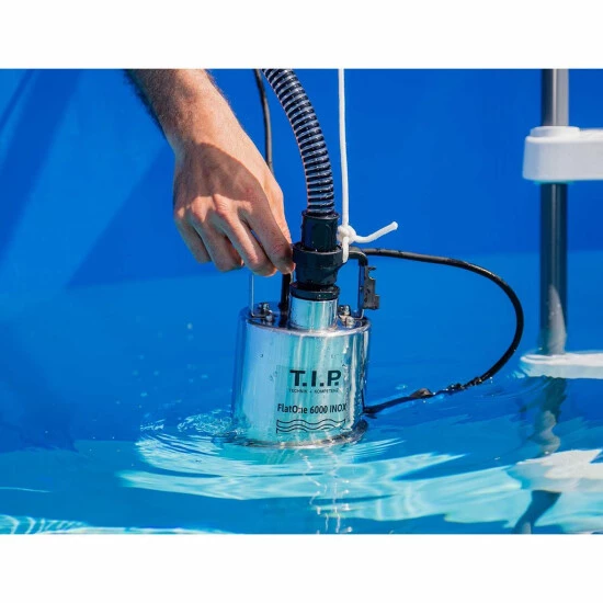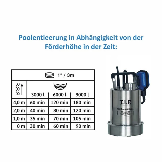 Die FlatOne 6000 INOX ist eine Tauchpumpe für spezielle Einsatzgebiete. Sie ist herrvoragend für den Betrieb mit klarem und leicht verschmutztem Wasser zur Ent- und Bewässerung geeignet.Mit der FlatOne 6000 INOX können auch Schwimmbecken, Pools, Zisternen und Behälter ausgepumpt werden.Der speziell entwickelte Pumpenfuß (flachabsaugend bis 1 mm Restwasserstand) verhindert das Ansaugen von Folien und ist deshalb ideal zur Trockenlegung von Räumen oder Pools. Dank vertikalem Ausgang und Rückschlagventil auch als Drainagepumpe einsetzbar.Anwendungsbereich:- Entwässerung des Poolcovers / Poolabdeckungen- Entwässerung von WhirlpoolsVorteile:- Flachabsaugend bis 1 mm – Im manuellen Betrieb können Sie mit der FlatOne 6000 INOX bis 1 mm Restwasserstand wischtrocken entwässern.- Wischtrockene Flachabsaugung durch speziellen Pumpenfuß, der auch das Ansaugen der Poolbodenfolie verhindert- Volledelstahlpumpe (AISI 304) und somit chlorresistent- Inklusive Mehrdimensions-Anschlussstück für variable Anschlussgrößen- Optimaler Betriebspunkt bei 0,15 bar (ideal für 0,8 m – 1,5 m Beckenhöhe)- Auch zur Notentwässerung oder als Drainage-Tauchpumpe nutzbar- Poolentleerung innerhalb kurzer Zeit.- Spezieller Pumpenfuß verhindert das Ansaugen der Poolbodenfolie- Flachabsaugend bis 1 mm Restwasserstand im manuellen Betrieb (wischtrocken)- Schutz vor Trockenlauf durch Schwimmerschalter- Arretierbarer Schwimmerschalter für den automatischen bzw. manuellen Betrieb- Volledelstahlpumpe (AISI 304) und somit chlorresistent- Inklusive Mehrdimensions-Anschlussstück für variable Anschlussgrößen- Leert alle gängigen Aufstellpools in unter 2 Stunden- Optimaler Betriebspunkt bei 0,15 bar (ideal für 0,8 m – 1,5 m Beckenhöhe)- Auch zur Notentwässerung oder als Drainage-Tauchpumpe nutzbarOptimal für Pools: Der speziell entwickelte Pumpenfuß der FlatOne 6000 INOX (flachabsaugend bis 1 mm Restwasserstand) verhindert das Ansaugen Ihrer Schwimmbad- oder Poolbodenfolie.Schwimmerschalter:Dank der Ein- und Ausschaltautomatik des Schwimmerschalters geschützt vor Trockenlauf Arretierbarer Schwimmerschalter für den automatischen bzw. manuellen Betrieb.Motor:Mit energieeffizienter Motorwicklung aus hochwertigem Kupfer. Somit ist diese Pumpe besonders sparsam. Zudem ist ein thermischer Motorschutz integriert.Lieferumfang:Multidimensions-Anschlussstück (1 1/4 “ AG)RückschlagventilTechnische Daten:Motor: 300 WattFörderhöhe / Druck max.: 6 m / 0,6 barFördermenge: 100 l/min / 6.000 l/hPumpengehäuse: EdelstahlMindestabsaugniveau: 1 mm (manueller Betrieb)Selbstansaugniveau: 40 mmKorngröße max.: 1 mmEintauchtiefe max.: 7 mAnschlusskabel: 10 m / 05RN8-FTemperatur medium max.: 35 °CDruckanschluss: 39,59 mm (1 1/4″ IG)