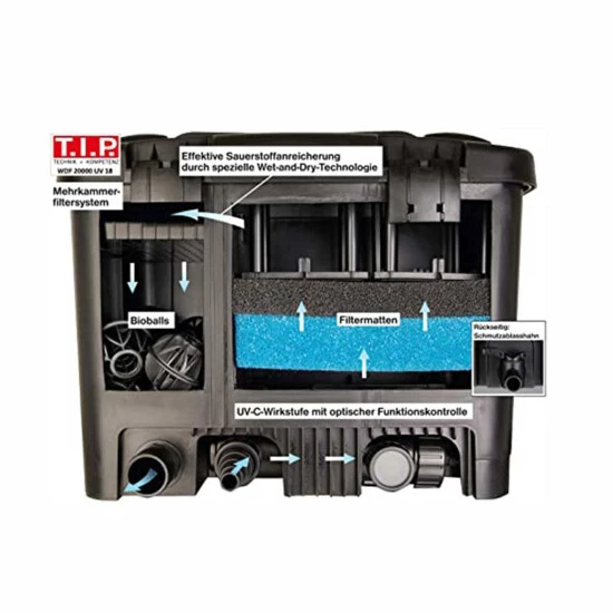 Dieser Filter ist ein hochwirksames Komplettsystem zur Teichfilterung. Selbstverständlich verfügt dieses Gerät über sämtliche herkömmlichen Filterstufen. Die Besonderheit liegt jedoch in der Realisierung des sogenannten Wet-and-dry-Systems. Dabei wird das vorgefilterte Wasser über eine Abrisskante geführt und dadurch mit Umgebungsluft angereichert.Daneben verfügt dieses erstklassige Produkt über einen, sonst ebenfalls nur bei deutlich teureren Geräten üblichen Schmutzablasshahn (Ø 25 mm), der einen ungleich höheren Reinigungskomfort bedeutet.Teichfilter aus dr TIP WDF Serie- Komplettlösungen zur Bewahrung des biologischen Gleichgewichts und- Unterstützung natürlicher Prozesse im Teich- Kombination verschiedener Filtertechniken reinigt das Wasser effizient- Starke Anreicherung des Wassers mit Sauerstoff durch die Wet-and-Dry-Technologie- UV-C Strahler zur Reduzierung der Algenbildung- Besonders wartungsfreundliche Konzeption mit Schmutzablasshahn Mehrkammer-Teichaußenfilter für starke Anreicherung des Wassers mit Sauerstoff mit Wet-and-Dry-TechnologieDie neuartigen Filter der Serie WDF sind hochwirksame Komplettsysteme zur Reinigung des Teichwassers. Sie kombinieren bewährte Filtertechniken mit der innovativen Wet-and-Dry-Technologie. Der besondere Effekt: Anreicherung des gefilterten Wassers mit zusätzlichem Sauerstoff. Diese Komponente bietet dem Privatanwender hoch professionelle Technologie. Es entsteht ein perfektes Zusammenspiel bewährter und neuartiger Filtertechnik. Diese Serie ist zudem besonders wartungsfreundlich.Mehrkammer-TeichaußenfilterDie Modelle der Serie WDF wurden für verschiedene Teichgrößen konzipiert. Während sich der WDF 10000 UV 11 für kleinere und mittelgroße Teiche bis zu einem Volumen von 10.000 Litern empfiehlt, eignet sich der leistungsstärkere WDF 20000 UV 18 für mittlere und größere Gewässer bis zu 20.000 Litern Fassungsvermögen.Filtertechnologie der WDF-SerieDie Modelle der Serie WDF erzielen ihre sehr guten Filterergebnisse durch eine höchst wirkungsvolle Kombination von bewährter Technik mit neuartiger Filtertechnologie. So bewährt sich das einzigartig effektive Mehrkammersystem seit vielen Jahren mit großem Erfolg in der Praxis. Das Wasser durchfließt Kammern mit verschiedenen Filtermedien und wird zusätzlich durch einen leistungsstarken UV-C Strahler gereinigt.Wet-and-Dry TechnologieErgänzt wird das Mehrkammersystem durch die speziell konzipierte Wet-and-Dry-Technologie. Das vorgefilterte Wasser wird dabei über eine Abrisskante geführt und stark mit Umgebungsluft angereichert. Dadurch erfolgt die zielgerichtete Zuführung von Sauerstoff, welcher zu den Grundvoraussetzungen für gesundes Teichwasser und ein intaktes biologisches Gleichgewicht zählt.Gesundes Wasser im TeichDieses perfekte Zusammenspiel beider Techniken bewirkt eine Teichfilterung auf hohem Niveau und sorgt nachhaltig und sehr effizient für gesundes Wasser im Teich. Abgerundet werden die Modelle der Serie WDF durch ihre besonders wartungsfreundliche Konzeption. Durch Öffnen eines Schmutzablasshahns lassen sich die Partikel, die sich im Laufe der Zeit im Filter sammeln, beseitigen.Komplettlösung – Bereit zum sofortigem EinsatzIm Lieferumfang sind folgende Komponenten enthalten:- UV-C Strahler und Filtermaterial- Pumpe, Zulauf- und Ablaufschlauch- verschiedene AnschlüsseVerschiedene Wirkstufen des FiltersDas Teichwasser durchfließt mehrere Kammern mit verschiedenen Filtermaterialien. Mit der innovativen Wet-and-Dry-Technologie wird das gefilterte Wasser zusätzlich mit Sauerstoff angereichert.UV-C StrahlerUV-C Strahler sorgen für die Reduzierung des Algenwachstums und senken die Belastung des Wassers mit schädlichen Bakterien und Keimen. Der UV-C Strahler verfügt über eine optische Funktionskontrolle. Mit einem Blick lässt sich überprüfen, ob die UV-C Wirkstufe in gewünschter Weise funktioniert.Technische Daten Pumpe:Motor: 75 WattFörderhöhe / Druck max.: 3 mFördermenge max.: 4.000 l/hEintauchtiefe max.: 2 mNetzanschlußkabel: 10 m / H05RN-FTechnische Daten UV-C-Klärer:UV-C-Röhre: 18 WattArtikelnr. T.I.P. UV-C Röhre: 30988Netzanschlußkabel: 5 m / H05RN-FTechnische Daten Filter:Teichvolumen max.: 20.000 lFiltereingang: Ø 25 mm / 1″Filterausgang: Ø 50 mm / 2″Filterbehälter: 70 lLieferumfang:- Filterpumpe- Filterbehälter- BIOMEC-Filtermatte- Bioballs- Wet-and-Dry-Einheit- Schmutzablasshahn- UV-Klärer mit Vorschaltgerät- 3 m Zulaufschlauch (Ø 25 mm / 1″) – 2 m Ablaufschlauch (Ø 50 mm / 2″)
