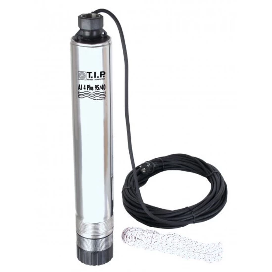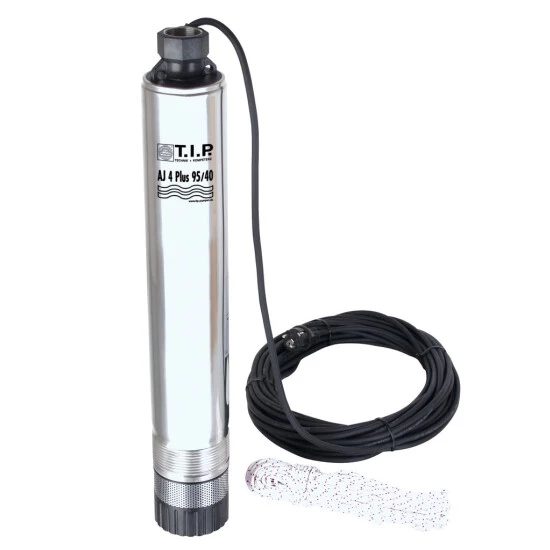 Tiefbrunnenpumpe mit Edelstahl-Pumpengehäuse und mehrstufigem Pumpenlaufwerk. Sandsicher bis 50 g/m³ Wasser. Mit integriertem Rückschlagventil, 23 m Anschlusskabel und 21 m Ablassseil. Der geringe Außendurchmesser von nur 9,6 cm ermöglicht den Einsatz in schmalen Bohrbrunnen schon ab einem Ø von 10 cm. Zur Förderung von Wasser aus großer Tiefe und Weiterleitung mit hohem Druck. Außerdem zeichnet sich das Model mit 6 schwimmenden Laufrädern der Serie AJ durch seine große Fördermenge aus.
